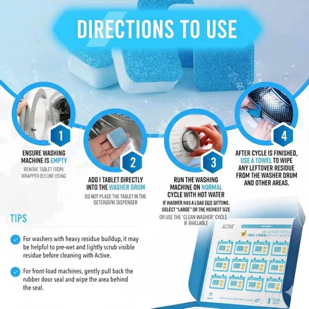 - 💧 Easy to Use – Just drop one tablet and run a cycle